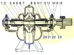 1、泵体 2、泵盖 ![]() 3、叶轮 4、轴 5、双吸密封环 6、轴套 7、填料套 8、填料 9、填料环 10、填料压盖 11、轴套螺母 12、轴承体 13、固定螺丝 14、轴承体压盖 15、单列向心球轴承 16、联轴器部件 17、轴承端盖 18、挡水圈 19、螺柱 20、键 |